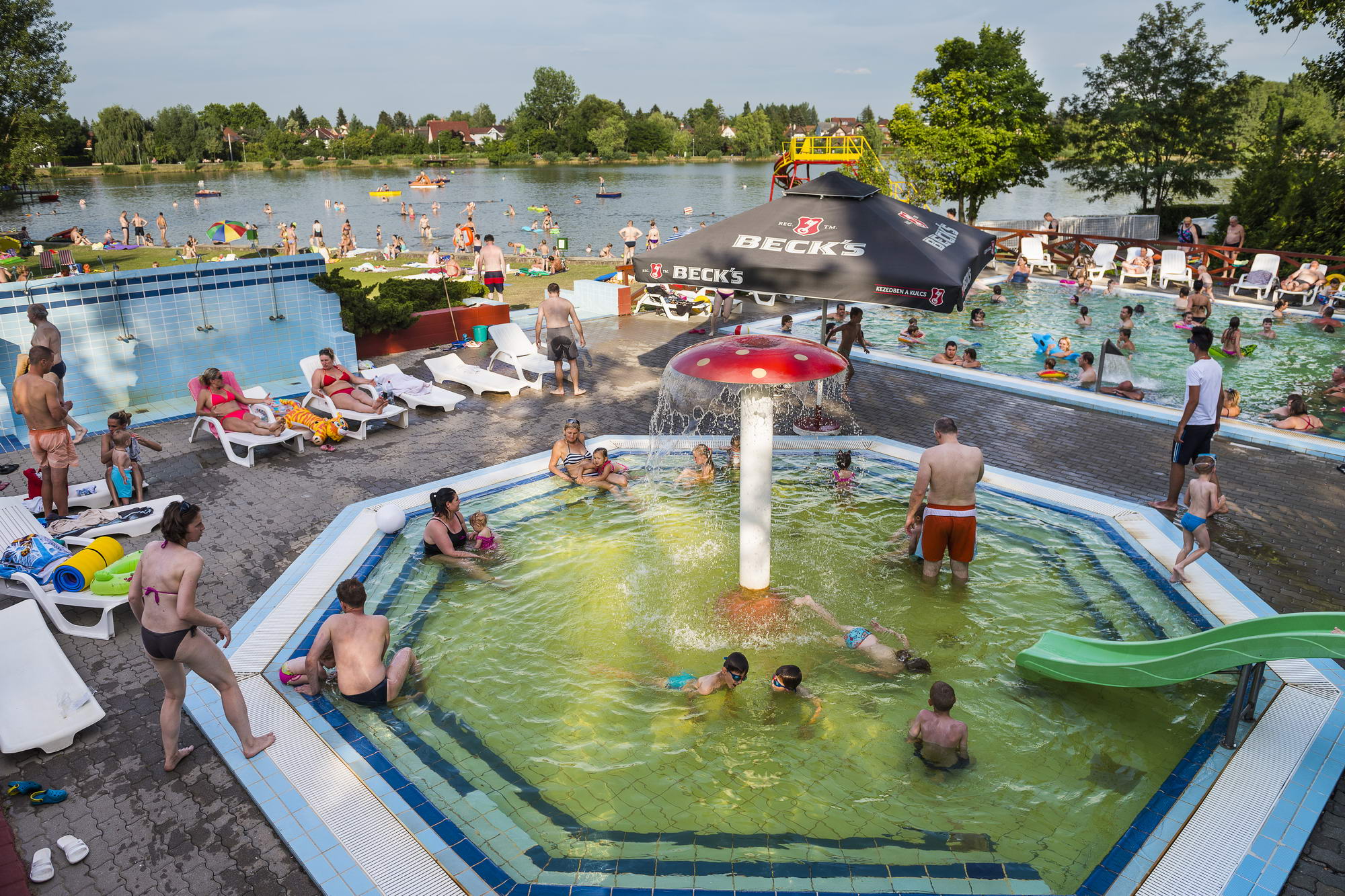 Ennek partjára selymes Tisza-fövenyt terítettek, és Kovács Tibor tervei alapján 1930-ban megépítették a balatonfüredi fürdőházat idéző faépületet. A 2000 négyzetméteres parkosított területen egy gyógymedence (34°C), és egy gyermek csúszdával és vízi gombával kialakított gyermekmedence várja a strandolókat. A tófürdő 1325 vendéget fogadhat egyszerre. Éttermek, büfék, strand-röplabdapálya, vízi csúszda szolgálja az idelátogatók szórakozását és kényelmét.